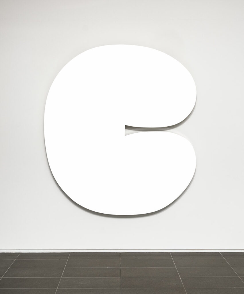 The flat face of Kelly’s White Form, an approximately 7-by-6-foot expanse of perfectly smooth aluminum that is 4.25 inches deep, conflicts with the big gentle curve of its silhouette. This creates subtle tension between the work’s actual dimensions and its suggestion of even greater volume.